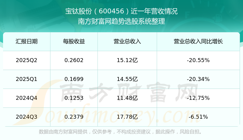 按照南方財富網(wǎng)概念查詢工具統(tǒng)計,該股所屬板塊為鈦板塊,該板塊共有27只股票,寶鈦股份2025第二季度營收在該板塊中排名為第12名,該板塊2025第二季度營收排名前十的股票如下表: