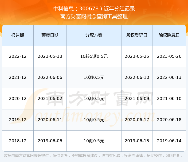 中科信息最新一次公布的分紅方案:10轉(zhuǎn)5派0.5元。