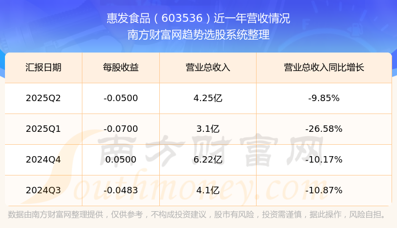 惠發(fā)食品披露了2025年第二季度財(cái)報(bào)。報(bào)告顯示,惠發(fā)食品2025年第二季度實(shí)現(xiàn)營收4.25億元,同比-9.85%;歸母凈利潤-1195.72萬元,同比3.39%。