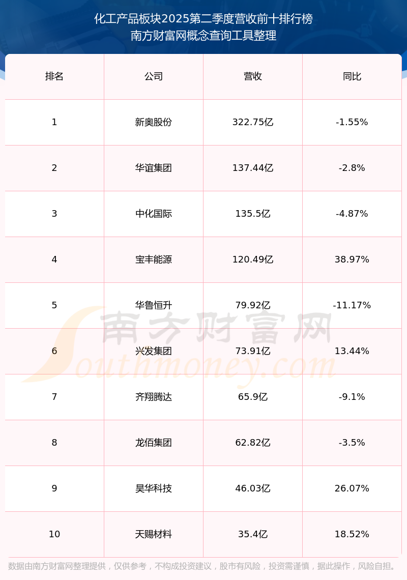 按照南方財(cái)富網(wǎng)概念查詢工具統(tǒng)計(jì),該股所屬板塊為化工產(chǎn)品板塊,該板塊共有65只股票,艾森股份2025第二季度營收在該板塊中排名為第65名,該板塊2025第二季度營收排名前十的股票如下表: