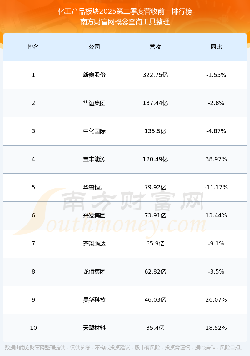 按照南方財富網(wǎng)概念查詢工具統(tǒng)計,該股所屬板塊為化工產(chǎn)品板塊,該板塊共有65只股票,巨化股份2025第二季度營收在該板塊中排名為第65名,該板塊2025第二季度營收排名前十的股票如下表:
