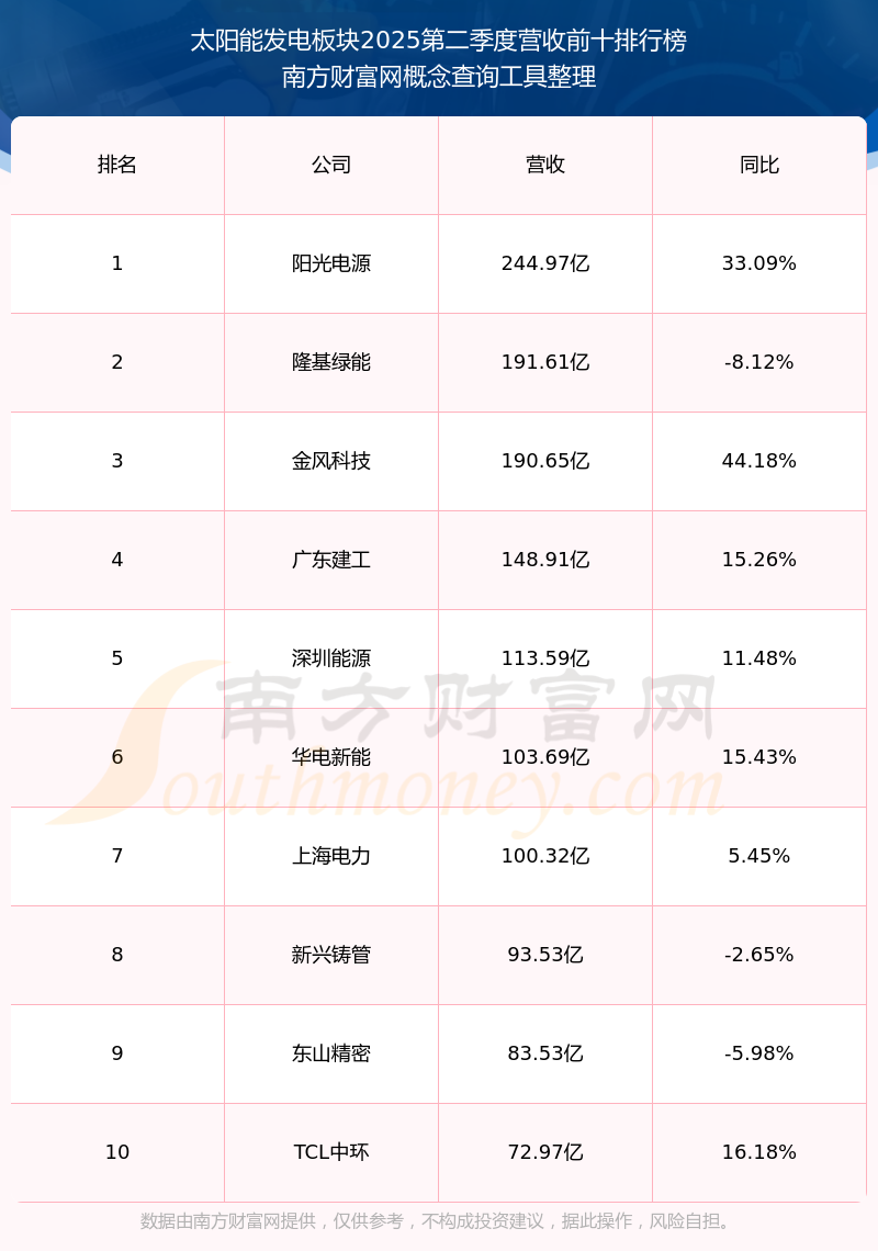 按照南方財(cái)富網(wǎng)概念查詢工具統(tǒng)計(jì),該股所屬板塊為太陽(yáng)能發(fā)電板塊,該板塊共有23只股票,三峽能源2025第二季度營(yíng)收在該板塊中排名為第23名,該板塊2025第二季度營(yíng)收排名前十的股票如下表: