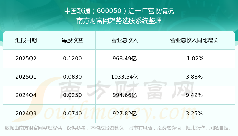 中國聯(lián)通(600050)發(fā)布2025年第二季度財報。2025年第二季度中國聯(lián)通實現(xiàn)營業(yè)收入968.49億元,同比增加-1.02元%,環(huán)比增加-6.29%;凈利潤為37.43億元,同比增長4.18%,環(huán)比增長43.65%。