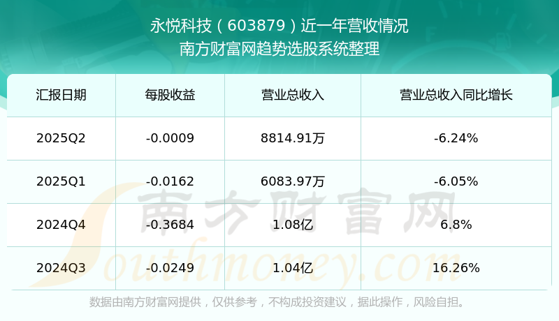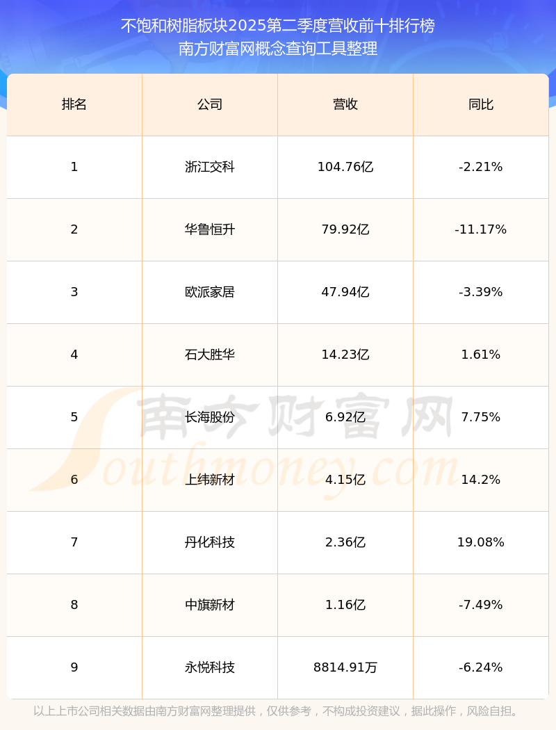 按照南方財(cái)富網(wǎng)概念查詢工具統(tǒng)計(jì),該股所屬板塊為不飽和樹脂板塊,該板塊共有9只股票,永悅科技2025第二季度營(yíng)收在該板塊中排名為第9名,該板塊2025第二季度營(yíng)收排名前十的股票如下表: