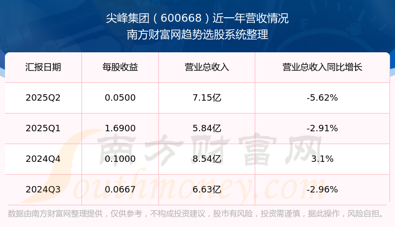 尖峰集團(tuán)2025年第二季度報(bào)告顯示,公司實(shí)現(xiàn)主營(yíng)業(yè)務(wù)收入7.15億元,較去年同期增長(zhǎng)-5.62%;歸屬于母公司股東的凈利潤(rùn)為3537.72萬元,同比增長(zhǎng)-21.72%;扣除非經(jīng)常性損益后的凈利潤(rùn)為3480.01萬元,同比增長(zhǎng)-20.15%。
