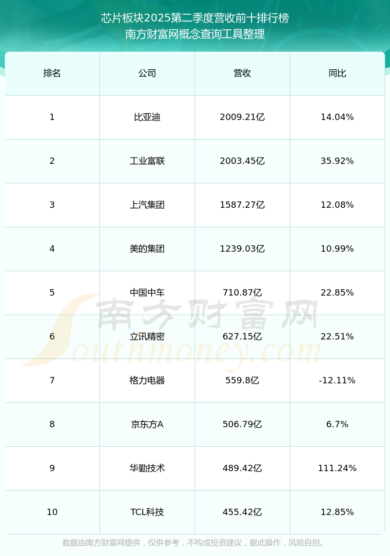 按照南方財富網(wǎng)概念查詢工具統(tǒng)計,該股所屬板塊為芯片板塊,該板塊共有941只股票,翱捷科技2025第二季度營收在該板塊中排名為第265名,該板塊2025第二季度營收排名前十的股票如下表: