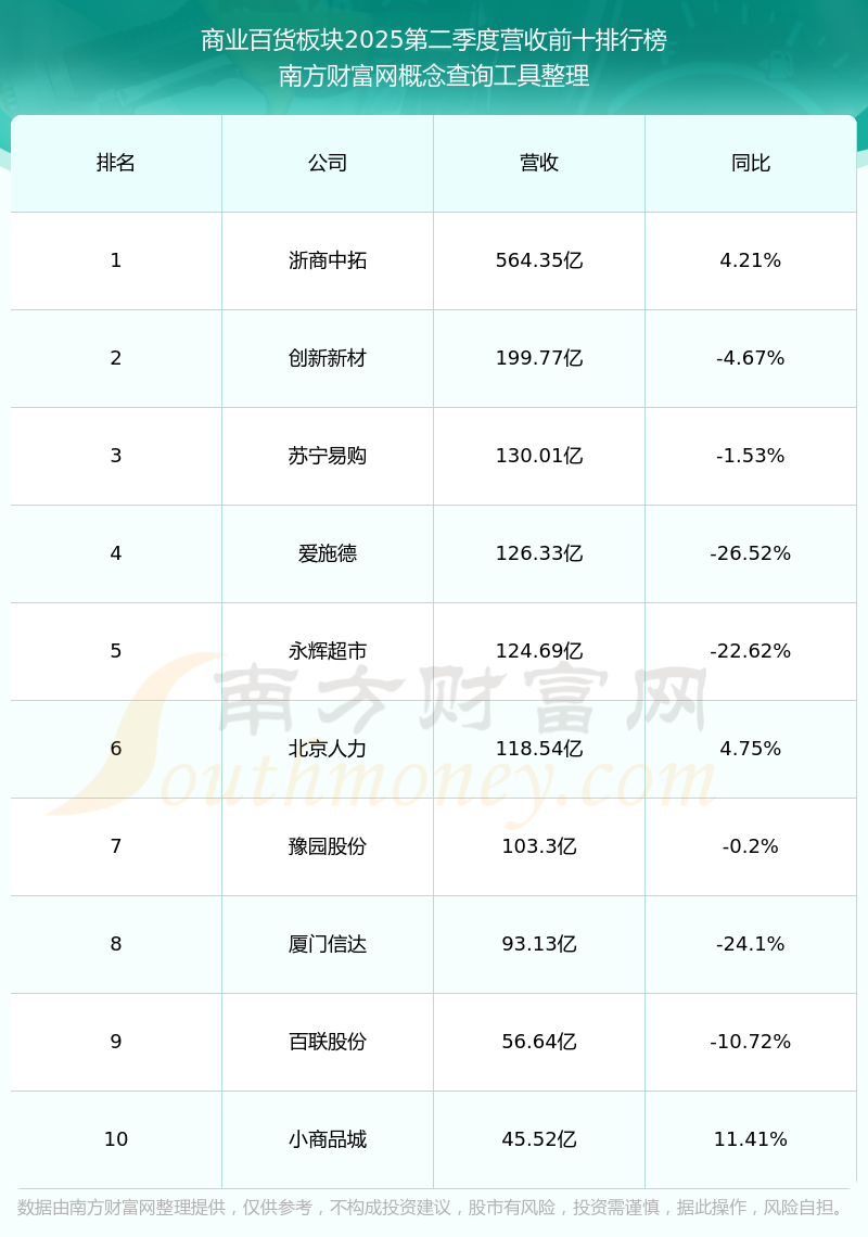 按照南方財(cái)富網(wǎng)概念查詢工具統(tǒng)計(jì),該股所屬板塊為商業(yè)百貨板塊,該板塊共有75只股票,重慶百貨2025第二季度營(yíng)收在該板塊中排名為第12名,該板塊2025第二季度營(yíng)收排名前十的股票如下表: