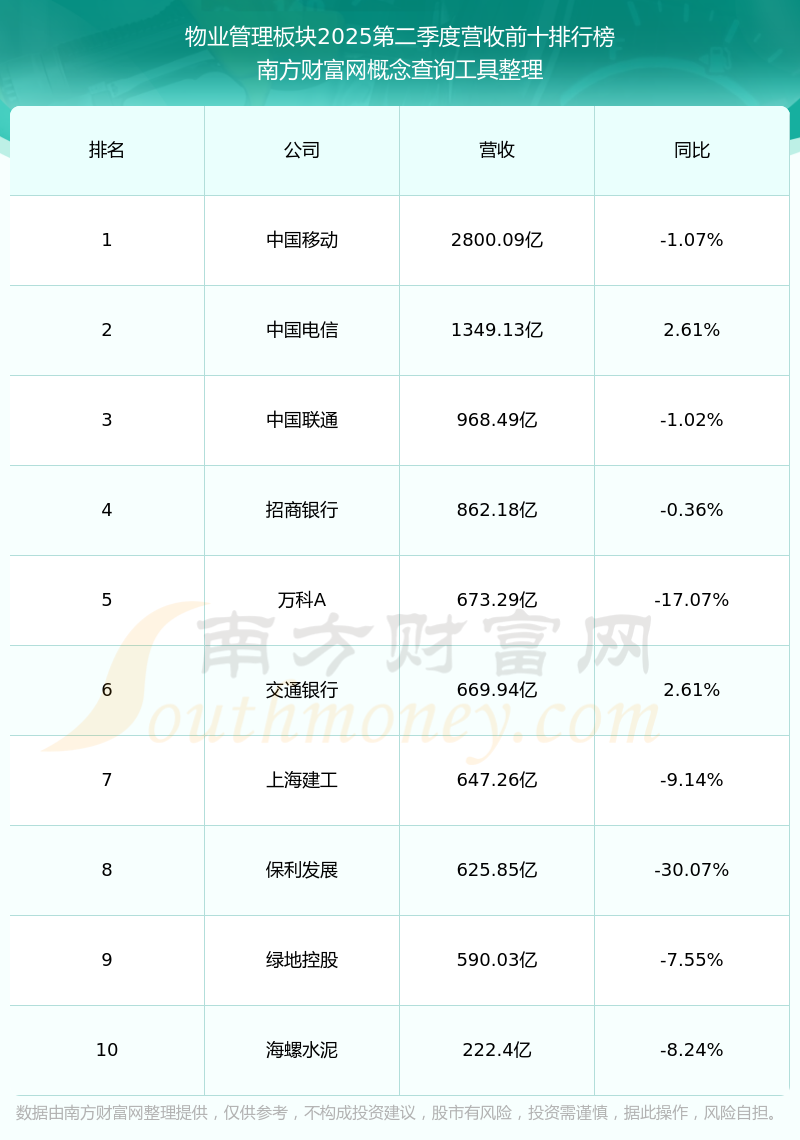 按照南方財(cái)富網(wǎng)概念查詢工具統(tǒng)計(jì),該股所屬板塊為物業(yè)管理板塊,該板塊共有140只股票,津投城開2025第二季度營收在該板塊中排名為第86名,該板塊2025第二季度營收排名前十的股票如下表: