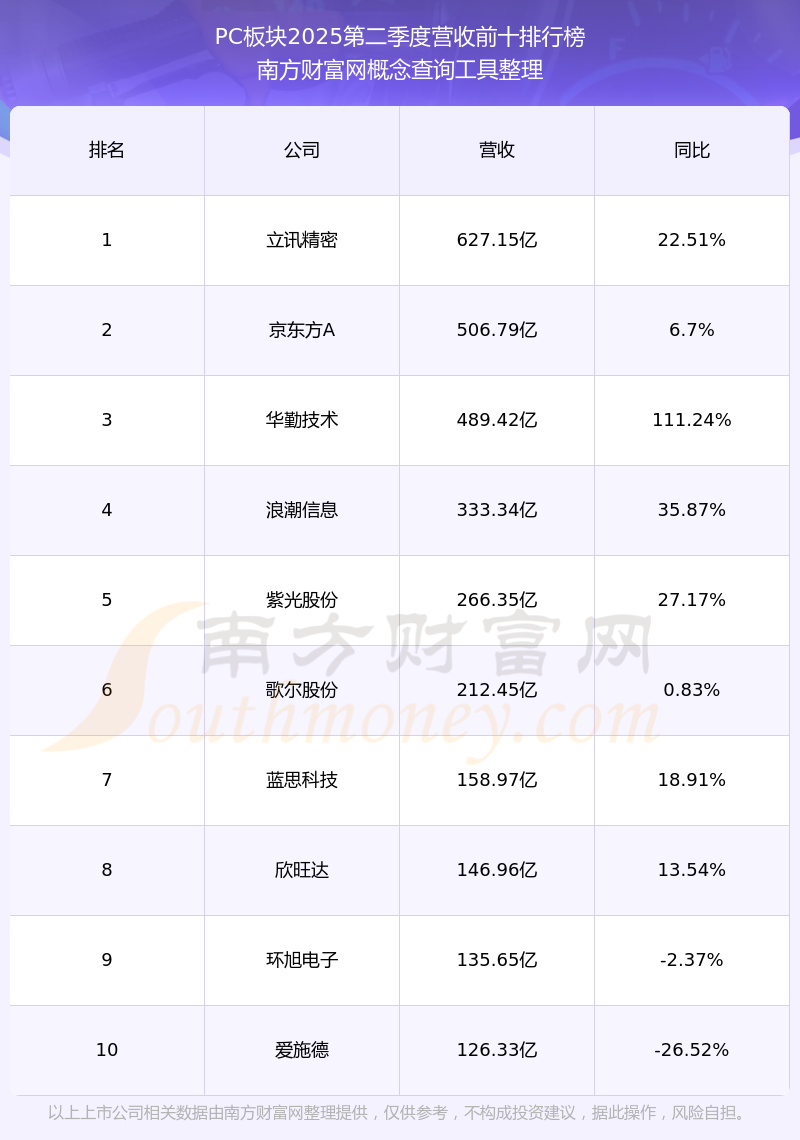 按照南方財富網(wǎng)概念查詢工具統(tǒng)計,該股所屬板塊為PC板塊,該板塊共有58只股票,方正科技2025第二季度營收在該板塊中排名為第58名,該板塊2025第二季度營收排名前十的股票如下表:
