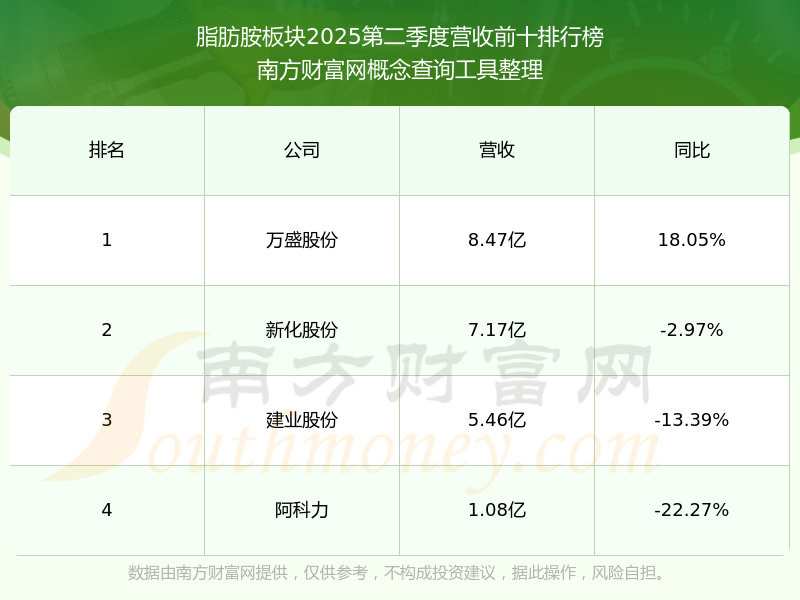 按照南方財(cái)富網(wǎng)概念查詢工具統(tǒng)計(jì),該股所屬板塊為脂肪胺板塊,該板塊共有4只股票,建業(yè)股份2025第二季度營(yíng)收在該板塊中排名為第3名,該板塊2025第二季度營(yíng)收排名前十的股票如下表: