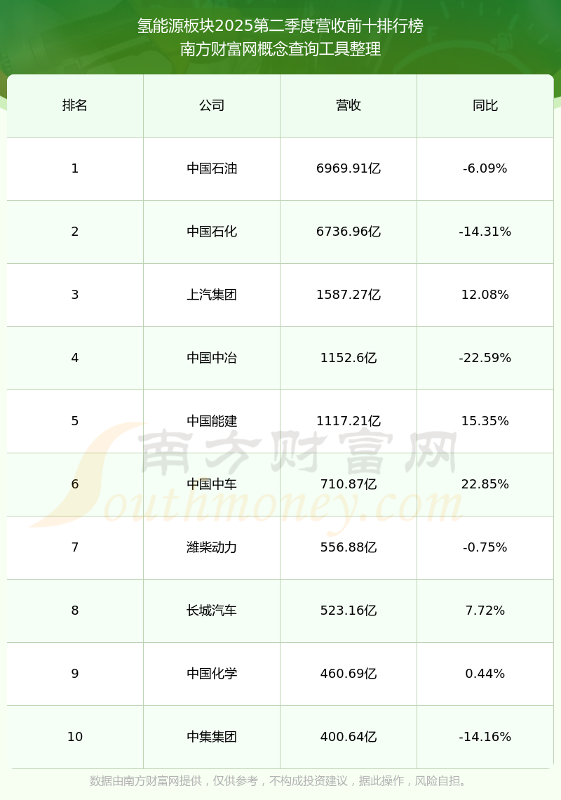 按照南方財(cái)富網(wǎng)概念查詢工具統(tǒng)計(jì),該股所屬板塊為氫能源板塊,該板塊共有330只股票,華電科工2025第二季度營收在該板塊中排名為第95名,該板塊2025第二季度營收排名前十的股票如下表: