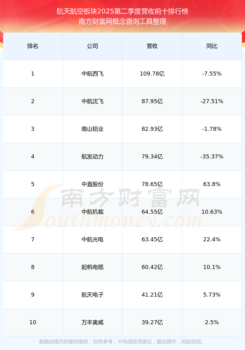 按照南方財(cái)富網(wǎng)概念查詢工具統(tǒng)計(jì),該股所屬板塊為航天航空板塊,該板塊共有119只股票,航天電子2025第二季度營收在該板塊中排名為第9名,該板塊2025第二季度營收排名前十的股票如下表: