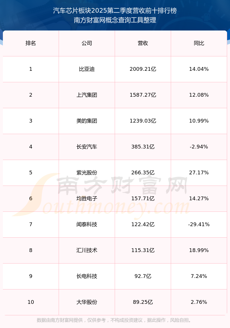 按照南方財(cái)富網(wǎng)概念查詢工具統(tǒng)計(jì),該股所屬板塊為汽車(chē)芯片板塊,該板塊共有213只股票,豪威集團(tuán)2025第二季度營(yíng)收在該板塊中排名為第15名,該板塊2025第二季度營(yíng)收排名前十的股票如下表: