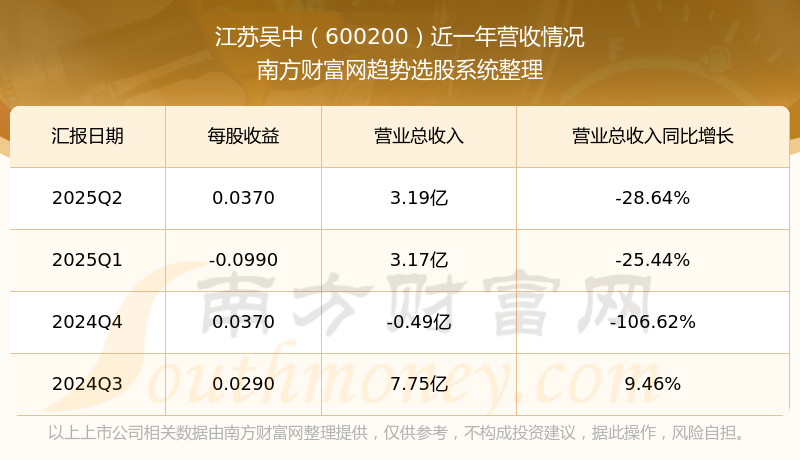 江蘇吳中2025年第二季度財(cái)報(bào)顯示,公司主營收入3.19億元,同比-28.64%;歸母凈利潤2590萬元,同比33.54%;扣非凈利潤2463.72萬元,同比96.39%;
