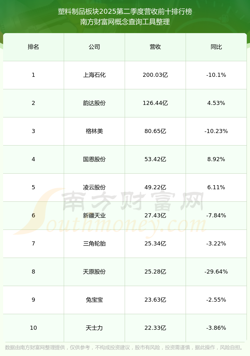 按照南方財富網(wǎng)概念查詢工具統(tǒng)計,該股所屬板塊為塑料制品板塊,該板塊共有85只股票,天龍股份2025第二季度營收在該板塊中排名為第56名,該板塊2025第二季度營收排名前十的股票如下表: