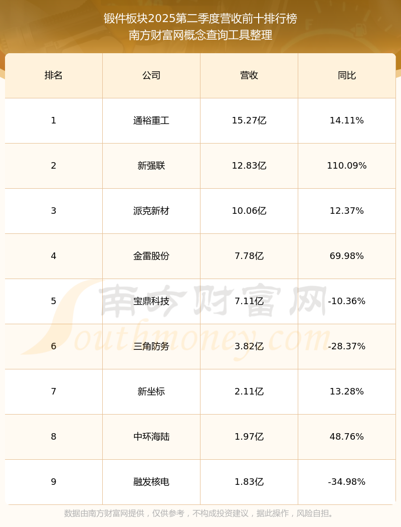 按照南方財(cái)富網(wǎng)概念查詢工具統(tǒng)計(jì),該股所屬板塊為鍛件板塊,該板塊共有9只股票,恒潤(rùn)股份2025第二季度營(yíng)收在該板塊中排名為第9名,該板塊2025第二季度營(yíng)收排名前十的股票如下表: