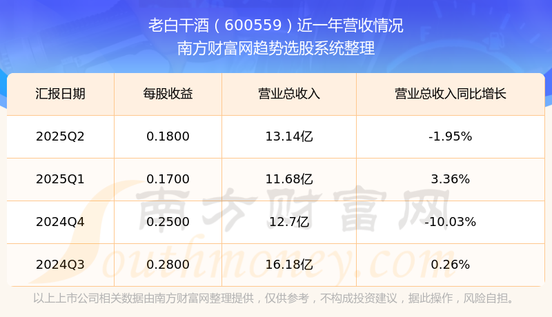 按照南方財(cái)富網(wǎng)概念查詢工具統(tǒng)計(jì),該股所屬板塊為白酒板塊,該板塊共有60只股票,老白干酒2025第二季度營收在該板塊中排名為第19名,該板塊2025第二季度營收排名前十的股票如下表: