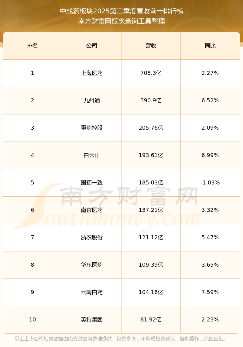 按照南方財(cái)富網(wǎng)概念查詢工具統(tǒng)計(jì),該股所屬板塊為中成藥板塊,該板塊共有108只股票,步長制藥2025第二季度營收在該板塊中排名為第20名,該板塊2025第二季度營收排名前十的股票如下表: