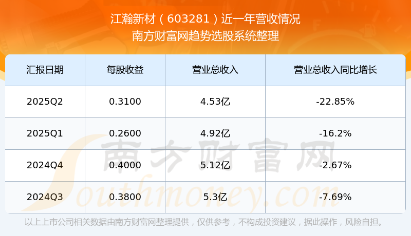 江瀚新材2025年第二季度財(cái)報(bào)顯示,公司主營(yíng)收入4.53億元,同比-22.85%;歸母凈利潤(rùn)1.14億元,同比-27.91%;扣非凈利潤(rùn)1.08億元,同比-27.59%;