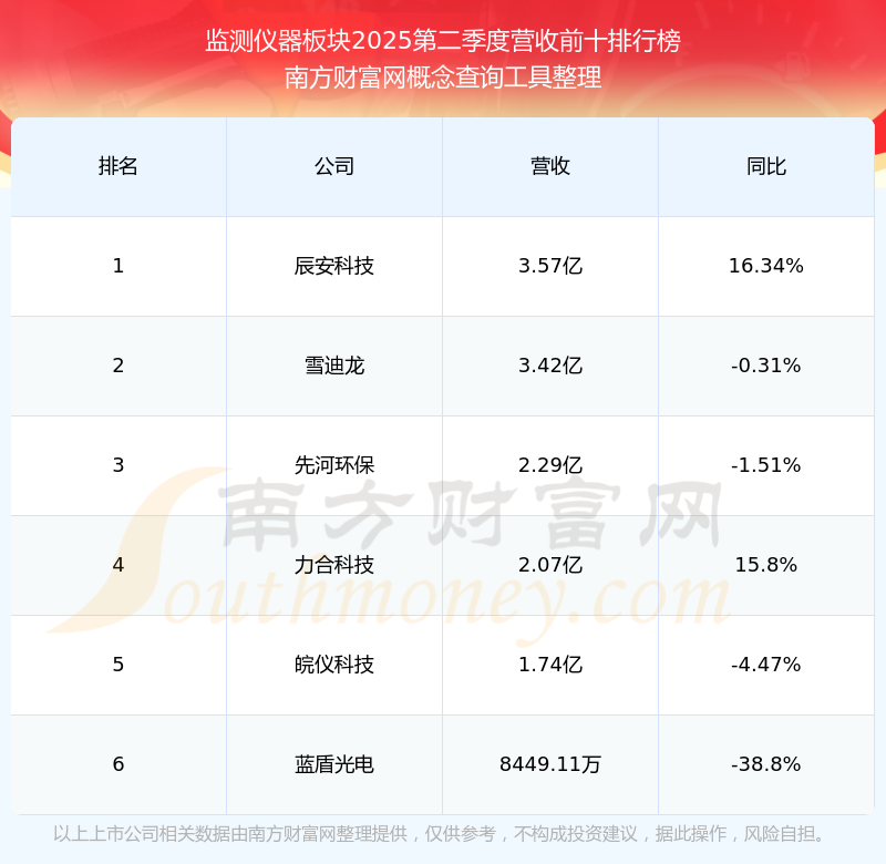 按照南方財(cái)富網(wǎng)概念查詢工具統(tǒng)計(jì),該股所屬板塊為監(jiān)測儀器板塊,該板塊共有6只股票,禾信儀器2025第二季度營收在該板塊中排名為第6名,該板塊2025第二季度營收排名前十的股票如下表: