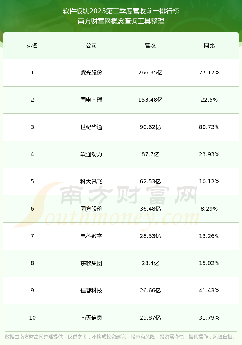 按照南方財富網(wǎng)概念查詢工具統(tǒng)計,該股所屬板塊為軟件板塊,該板塊共有246只股票,佳華科技2025第二季度營收在該板塊中排名為第221名,該板塊2025第二季度營收排名前十的股票如下表: