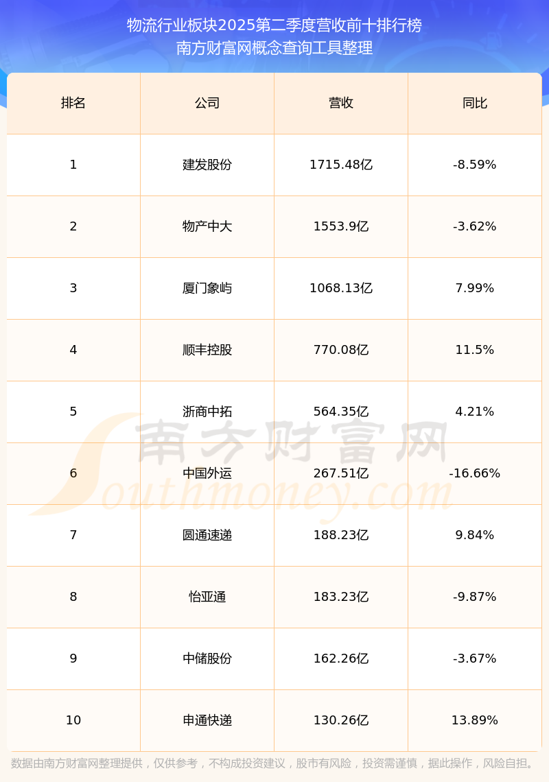 按照南方財(cái)富網(wǎng)概念查詢工具統(tǒng)計(jì),該股所屬板塊為物流行業(yè)板塊,該板塊共有58只股票,音飛儲(chǔ)存2025第二季度營收在該板塊中排名為第48名,該板塊2025第二季度營收排名前十的股票如下表: