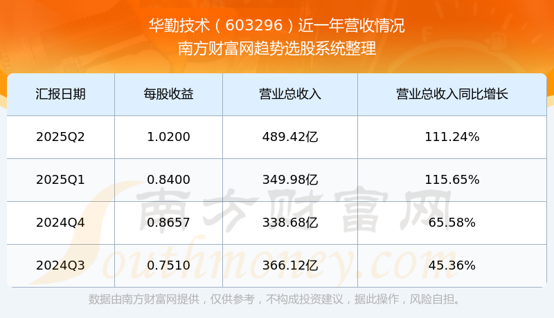華勤技術(shù)2025年第二季度顯示,公司主營(yíng)收入489.42億元,同比111.24%;歸母凈利潤(rùn)10.47億元,同比52.7%;扣非凈利潤(rùn)7.49億元,同比52.7%;