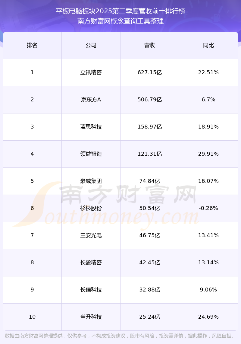 按照南方財(cái)富網(wǎng)概念查詢工具統(tǒng)計(jì),該股所屬板塊為平板電腦板塊,該板塊共有47只股票,華勤技術(shù)2025第二季度營(yíng)收在該板塊中排名為第47名,該板塊2025第二季度營(yíng)收排名前十的股票如下表: