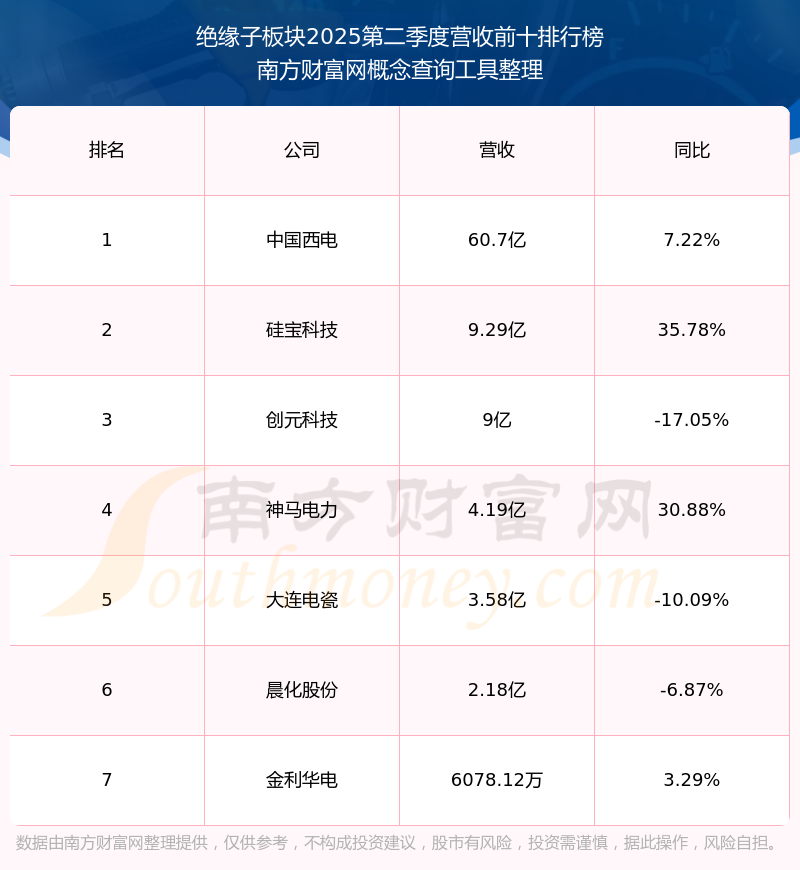 按照南方財(cái)富網(wǎng)概念查詢工具統(tǒng)計(jì),該股所屬板塊為絕緣子板塊,該板塊共有7只股票,神馬電力2025第二季度營(yíng)收在該板塊中排名為第4名,該板塊2025第二季度營(yíng)收排名前十的股票如下表: