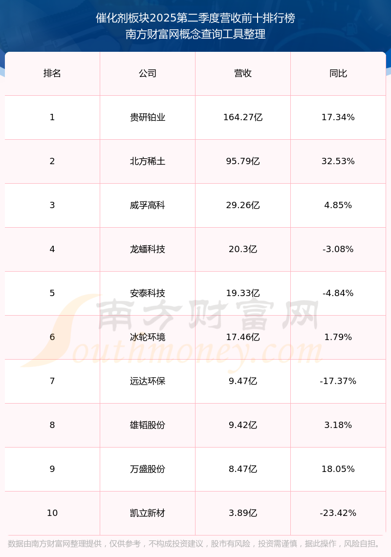 按照南方財富網(wǎng)概念查詢工具統(tǒng)計,該股所屬板塊為催化劑板塊,該板塊共有18只股票,中觸媒2025第二季度營收在該板塊中排名為第18名,該板塊2025第二季度營收排名前十的股票如下表: