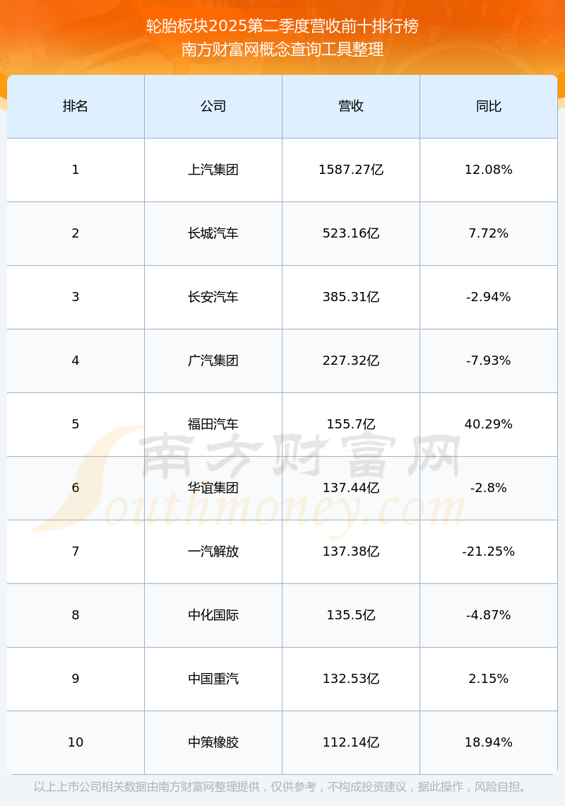 按照南方財(cái)富網(wǎng)概念查詢工具統(tǒng)計(jì),該股所屬板塊為輪胎板塊,該板塊共有58只股票,賽輪輪胎2025第二季度營(yíng)收在該板塊中排名為第13名,該板塊2025第二季度營(yíng)收排名前十的股票如下表: