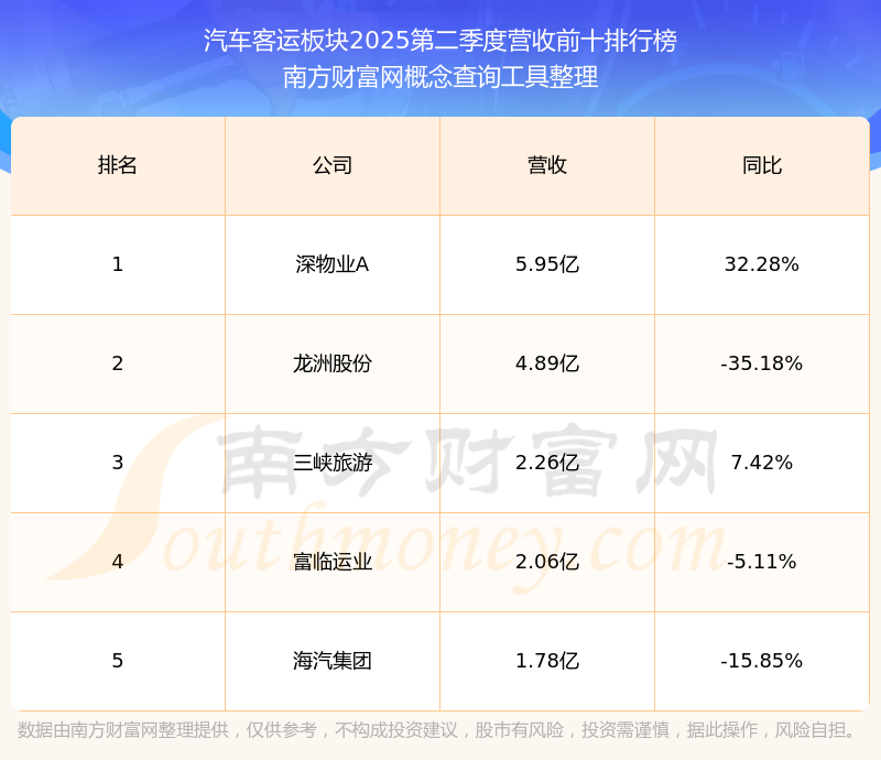 按照南方財(cái)富網(wǎng)概念查詢工具統(tǒng)計(jì),該股所屬板塊為汽車客運(yùn)板塊,該板塊共有5只股票,海汽集團(tuán)2025第二季度營(yíng)收在該板塊中排名為第5名,該板塊2025第二季度營(yíng)收排名前十的股票如下表: