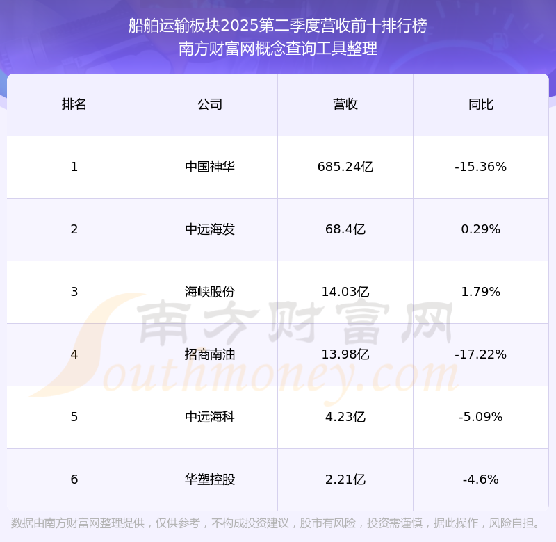 按照南方財富網概念查詢工具統(tǒng)計,該股所屬板塊為船舶運輸板塊,該板塊共有6只股票,招商輪船2025第二季度營收在該板塊中排名為第6名,該板塊2025第二季度營收排名前十的股票如下表: