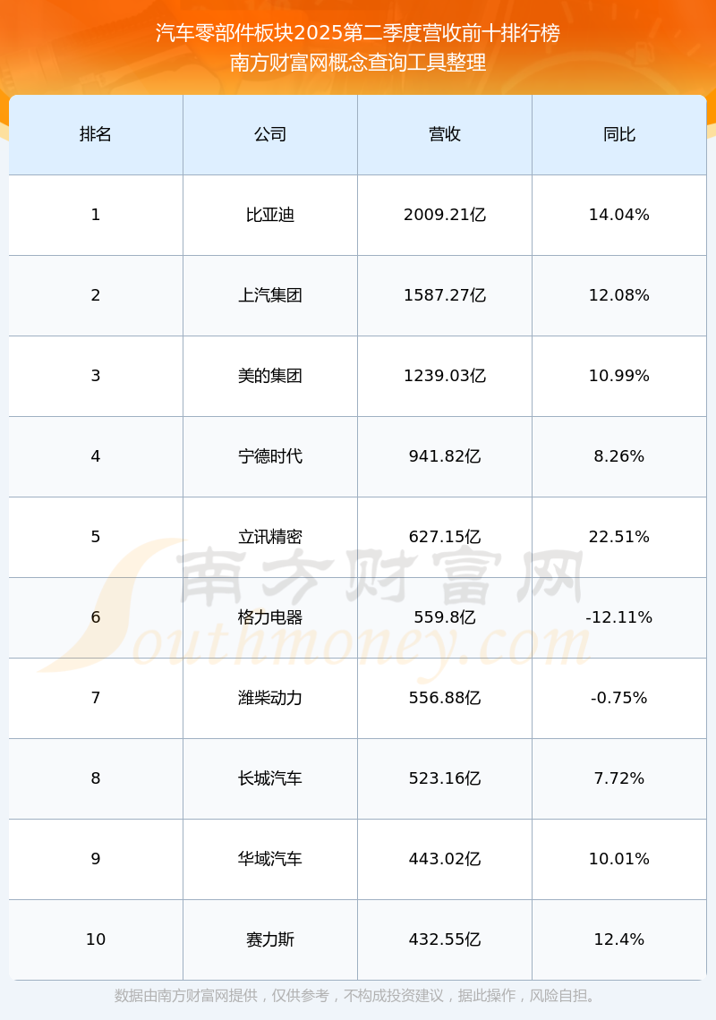 按照南方財富網(wǎng)概念查詢工具統(tǒng)計,該股所屬板塊為汽車零部件板塊,該板塊共有588只股票,寧波高發(fā)2025第二季度營收在該板塊中排名為第371名,該板塊2025第二季度營收排名前十的股票如下表:
