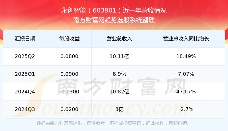 永創(chuàng)智能2025年第二季度顯示,公司主營收入10.11億元,同比18.49%;歸母凈利潤4079.68萬元,同比36.47%;扣非凈利潤3587.99萬元,同比-1.26%。