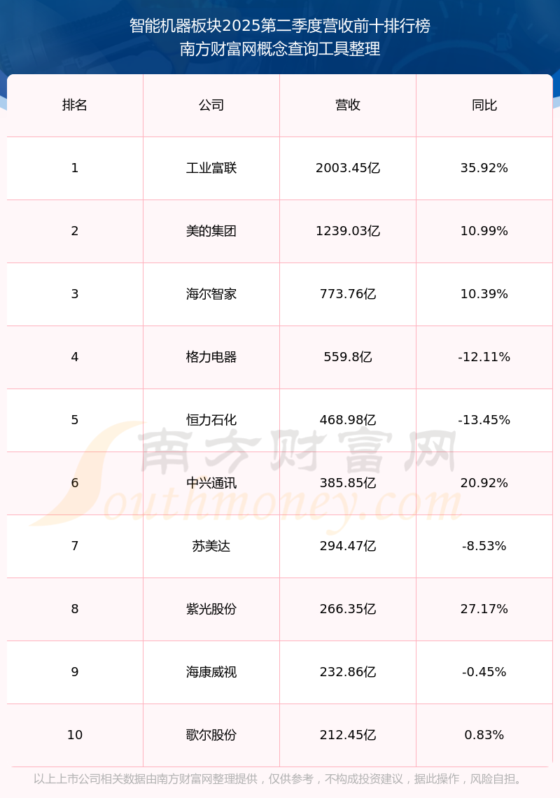 按照南方財富網(wǎng)概念查詢工具統(tǒng)計,該股所屬板塊為智能機(jī)器板塊,該板塊共有255只股票,永創(chuàng)智能2025第二季度營收在該板塊中排名為第78名,該板塊2025第二季度營收排名前十的股票如下表: