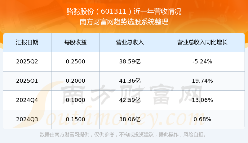 駱駝股份2025年第二季度顯示,公司主營(yíng)收入38.59億元,同比-5.24%;歸母凈利潤(rùn)2.95億元,同比86.79%;扣非凈利潤(rùn)1.99億元,同比13.9%;