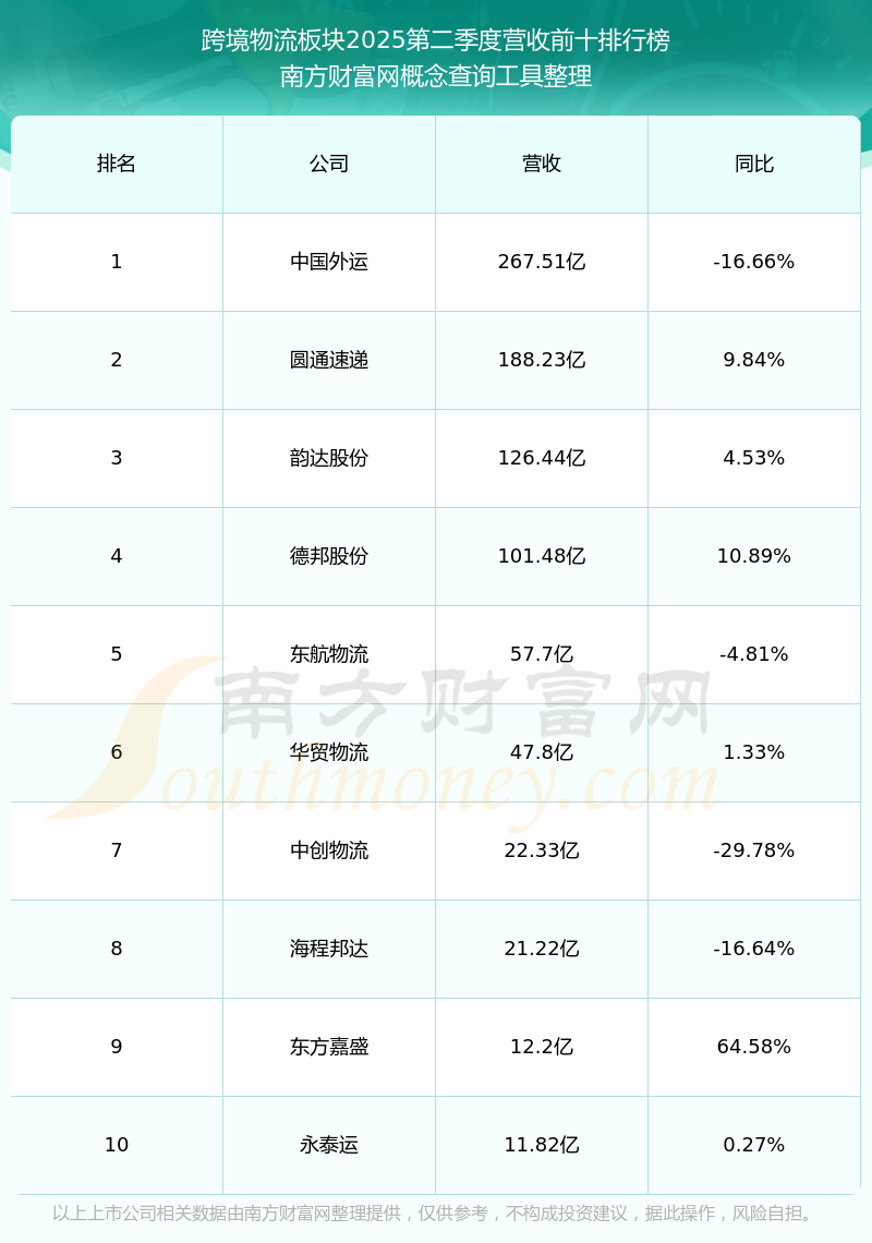 按照南方財富網概念查詢工具統(tǒng)計,該股所屬板塊為跨境物流板塊,該板塊共有14只股票,嘉友國際2025第二季度營收在該板塊中排名為第14名,該板塊2025第二季度營收排名前十的股票如下表: