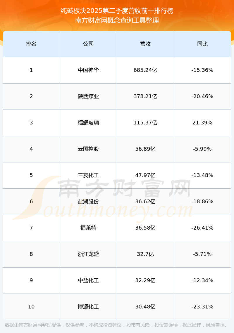 按照南方財(cái)富網(wǎng)概念查詢(xún)工具統(tǒng)計(jì),該股所屬板塊為純堿板塊,該板塊共有25只股票,江鹽集團(tuán)2025第二季度營(yíng)收在該板塊中排名為第21名,該板塊2025第二季度營(yíng)收排名前十的股票如下表: