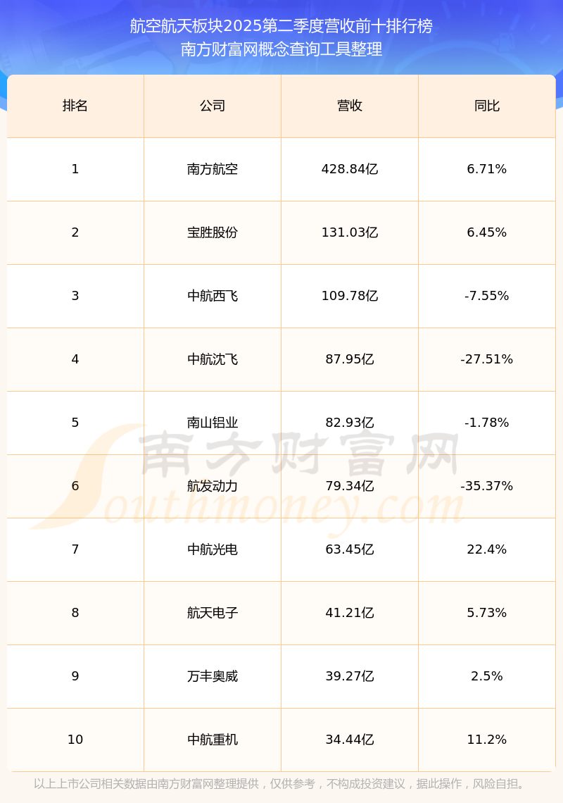 按照南方財富網(wǎng)概念查詢工具統(tǒng)計,該股所屬板塊為航空航天板塊,該板塊共有70只股票,航天環(huán)宇2025第二季度營收在該板塊中排名為第70名,該板塊2025第二季度營收排名前十的股票如下表: