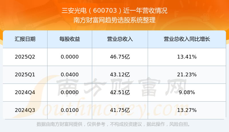 三安光電2025年第二季度顯示,公司主營收入46.75億元,同比13.41%;歸母凈利潤-3542.29萬元,同比-154.04%;扣非凈利潤-1.75億元,同比31.65%。