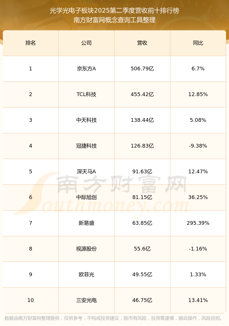 按照南方財富網(wǎng)概念查詢工具統(tǒng)計,該股所屬板塊為光學(xué)光電子板塊,該板塊共有133只股票,三安光電2025第二季度營收在該板塊中排名為第10名,該板塊2025第二季度營收排名前十的股票如下表: