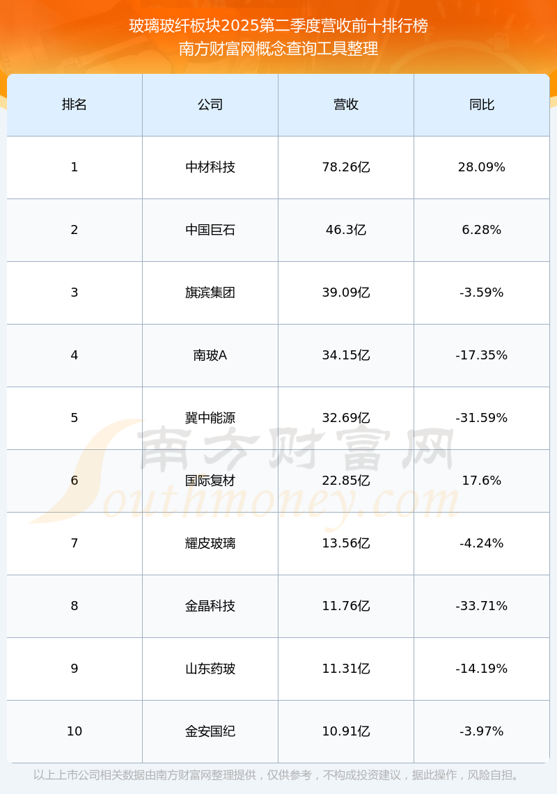 按照南方財(cái)富網(wǎng)概念查詢工具統(tǒng)計(jì),該股所屬板塊為玻璃玻纖板塊,該板塊共有23只股票,福耀玻璃2025第二季度營(yíng)收在該板塊中排名為第23名,該板塊2025第二季度營(yíng)收排名前十的股票如下表: