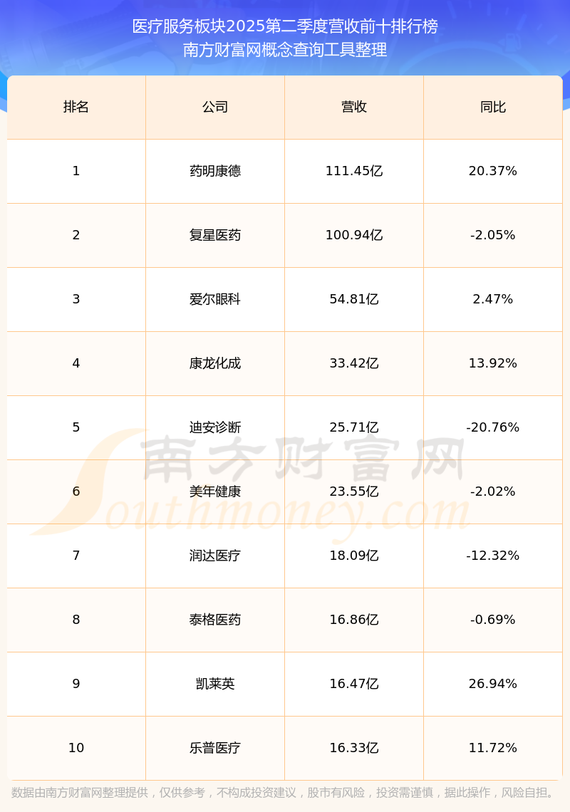 按照南方財(cái)富網(wǎng)概念查詢工具統(tǒng)計(jì),該股所屬板塊為醫(yī)療服務(wù)板塊,該板塊共有76只股票,通策醫(yī)療2025第二季度營(yíng)收在該板塊中排名為第25名,該板塊2025第二季度營(yíng)收排名前十的股票如下表:
