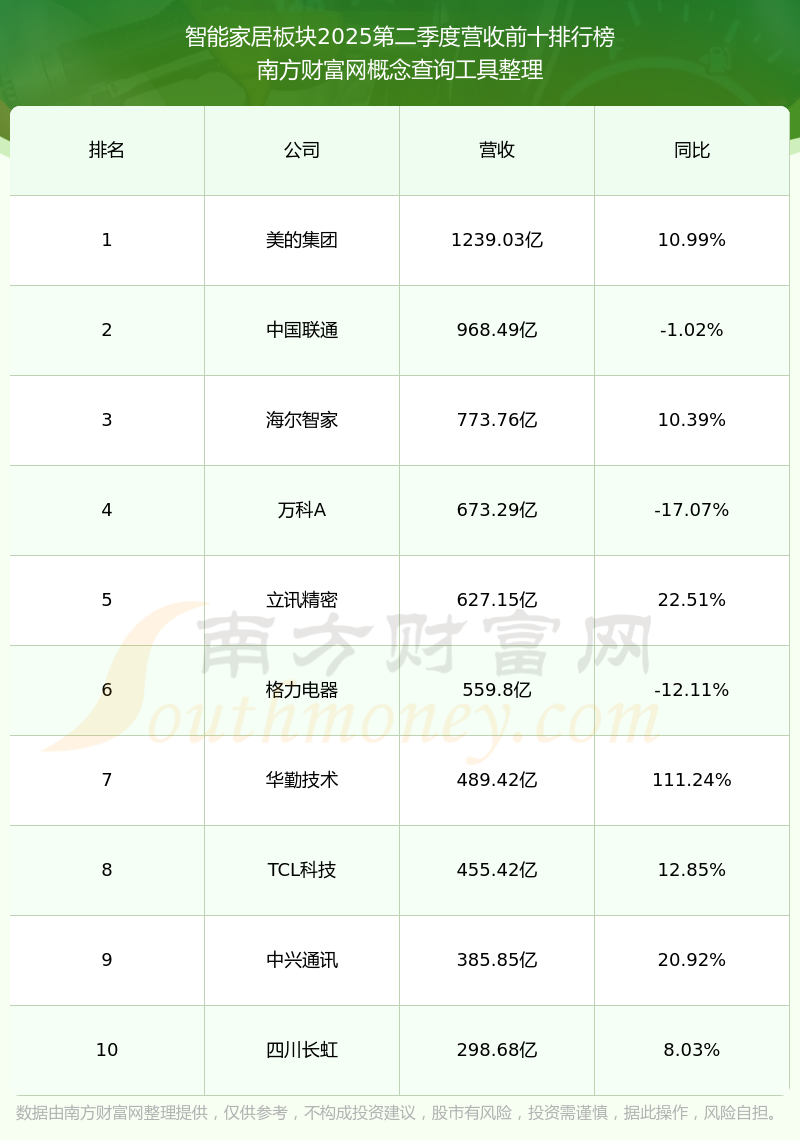 按照南方財(cái)富網(wǎng)概念查詢工具統(tǒng)計(jì),該股所屬板塊為智能家居板塊,該板塊共有299只股票,好太太2025第二季度營收在該板塊中排名為第196名,該板塊2025第二季度營收排名前十的股票如下表:
