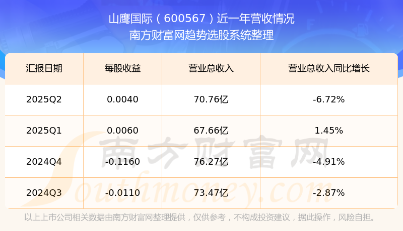 山鷹國(guó)際2025年第二季度顯示,公司主營(yíng)收入70.76億元,同比-6.72%;歸母凈利潤(rùn)900.09萬元,同比-87.92%;扣非凈利潤(rùn)-2144.94萬元,同比76.85%;