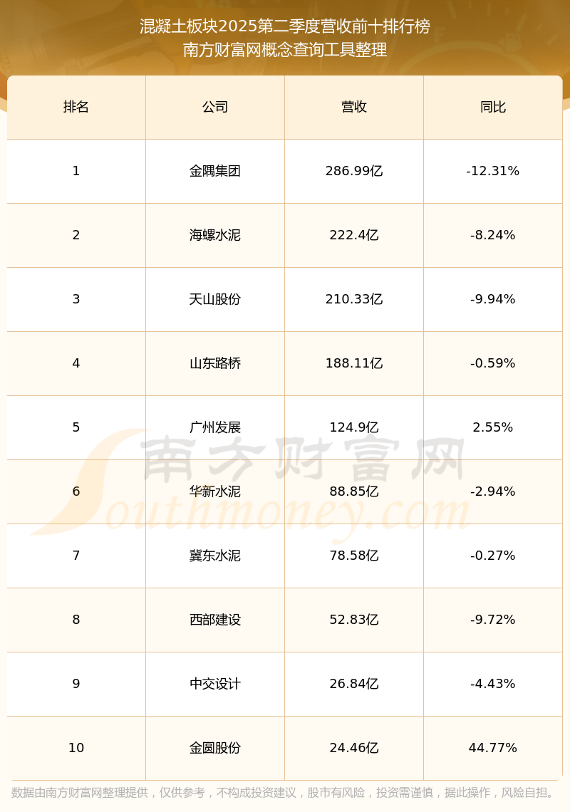 按照南方財富網(wǎng)概念查詢工具統(tǒng)計,該股所屬板塊為混凝土板塊,該板塊共有25只股票,金隅集團2025第二季度營收在該板塊中排名為第1名,該板塊2025第二季度營收排名前十的股票如下表: