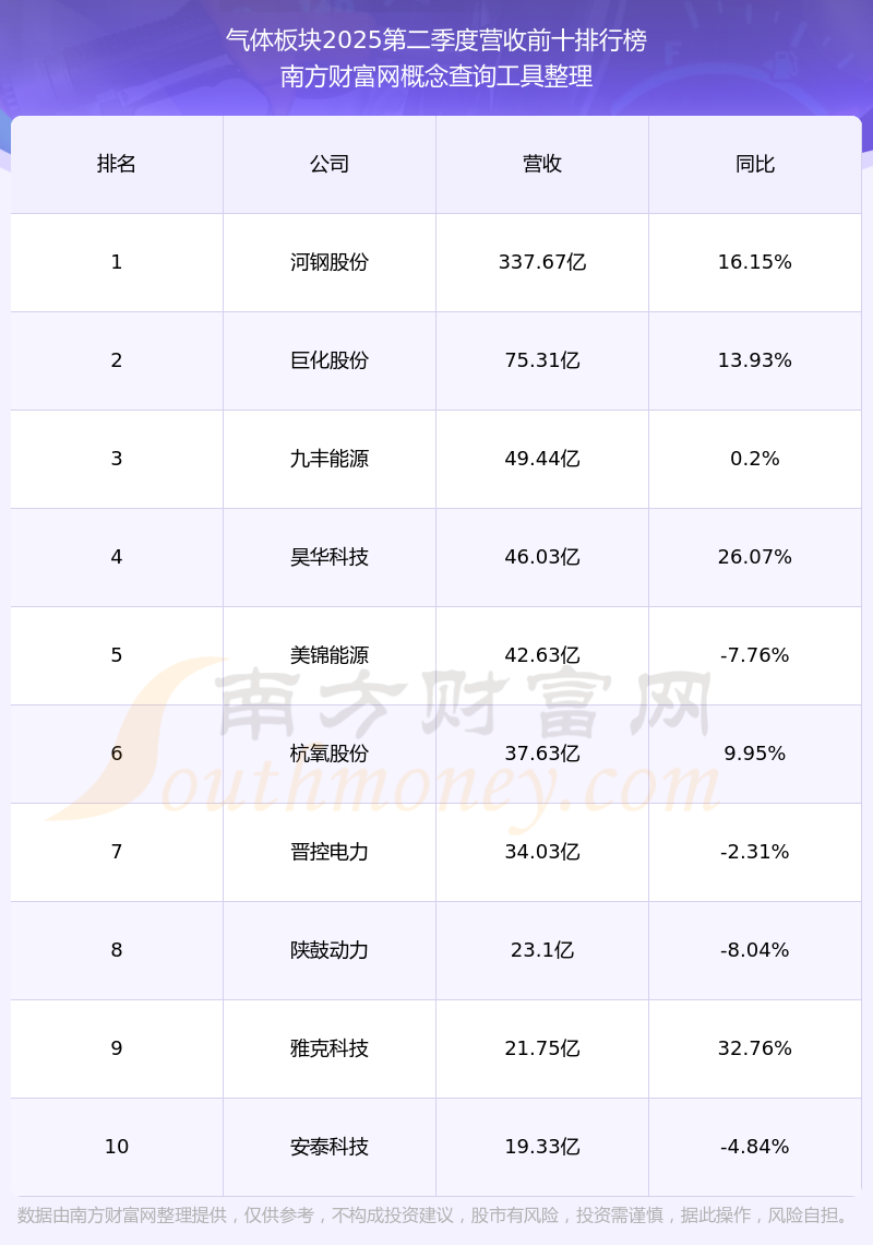 按照南方財(cái)富網(wǎng)概念查詢工具統(tǒng)計(jì),該股所屬板塊為氣體板塊,該板塊共有43只股票,廣鋼氣體2025第二季度營(yíng)收在該板塊中排名為第27名,該板塊2025第二季度營(yíng)收排名前十的股票如下表: