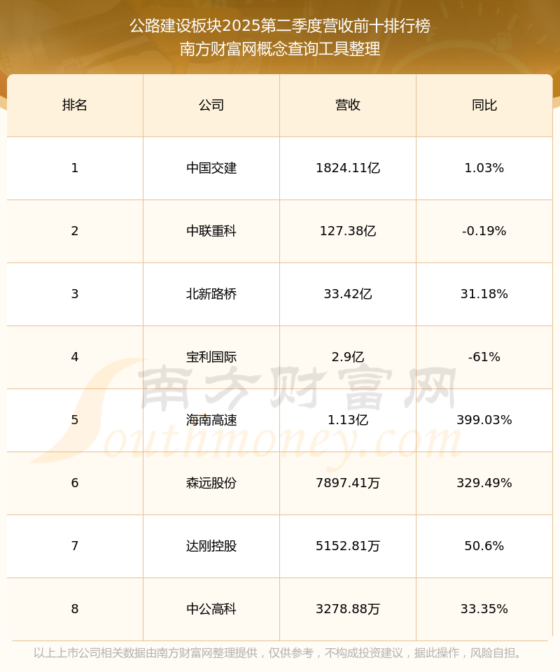 按照南方財富網(wǎng)概念查詢工具統(tǒng)計,該股所屬板塊為公路建設板塊,該板塊共有8只股票,交建股份2025第二季度營收在該板塊中排名為第8名,該板塊2025第二季度營收排名前十的股票如下表: