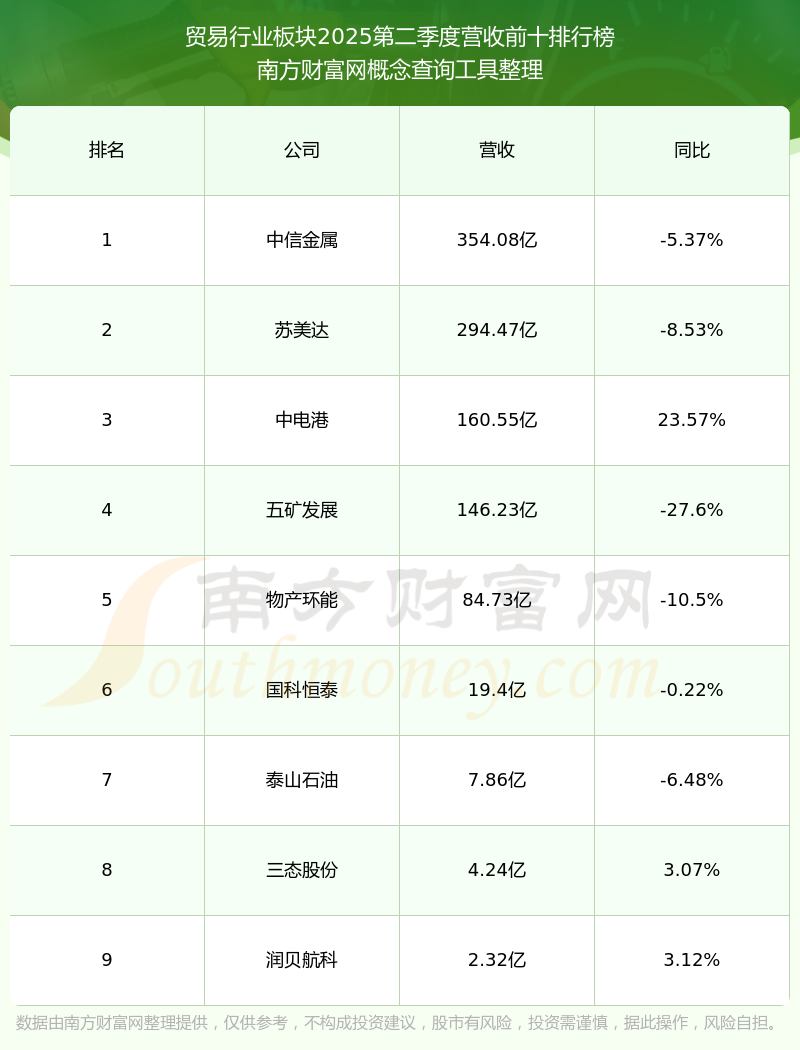 按照南方財(cái)富網(wǎng)概念查詢工具統(tǒng)計(jì),該股所屬板塊為貿(mào)易行業(yè)板塊,該板塊共有9只股票,東方創(chuàng)業(yè)2025第二季度營收在該板塊中排名為第9名,該板塊2025第二季度營收排名前十的股票如下表: